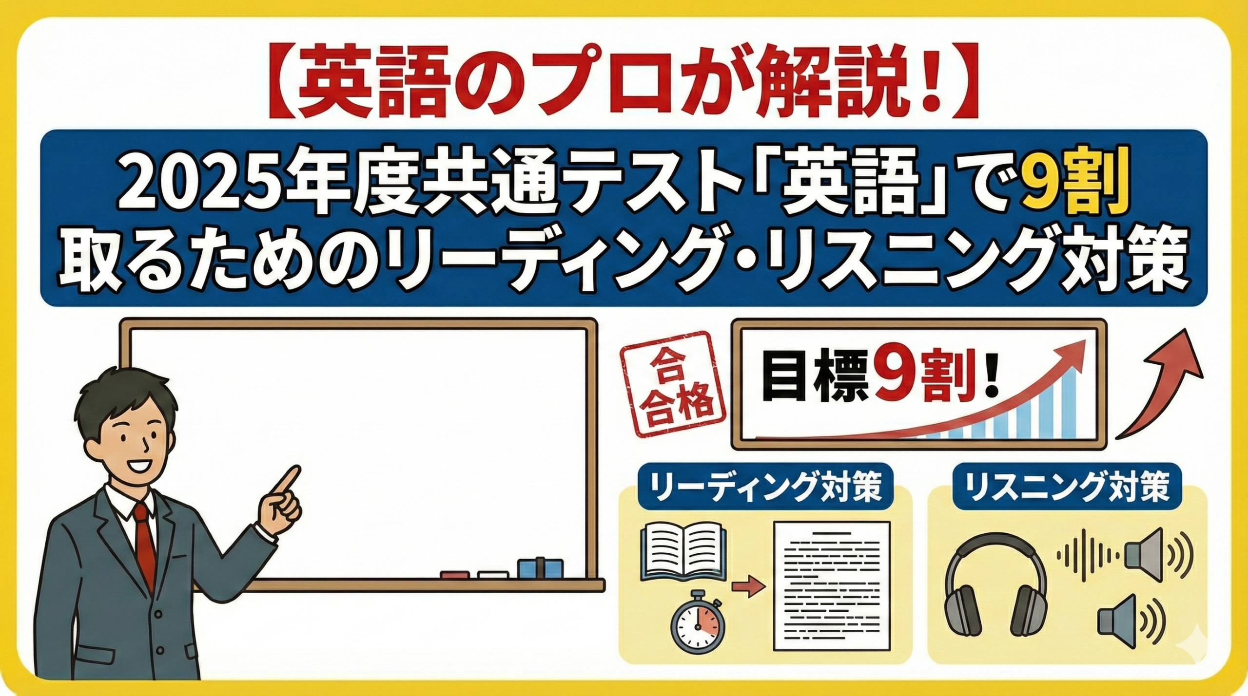 この記事では、2025年度共通テスト「英語」で9割(180点)以上を達成するための、リーディングとリスニングの具体的な対策法を解説しました。