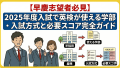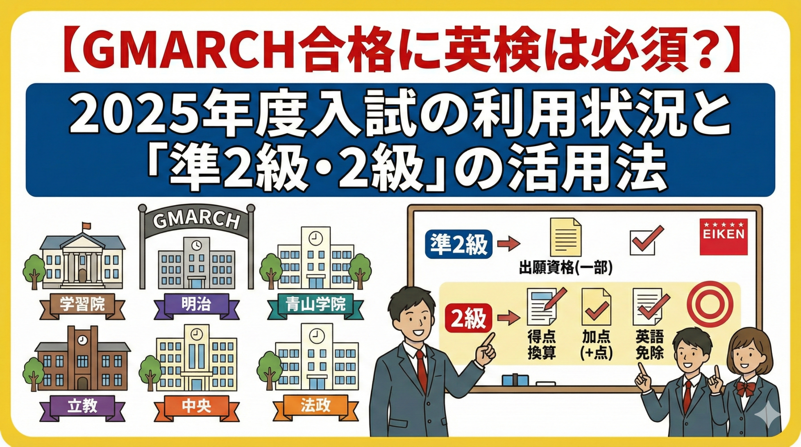 この記事では、2025年度入試におけるGMARCH各大学の英検利用状況を徹底的に分析し、特に多くの受験生が取得を目指す準2級・2級のスコアが、どのように合格に貢献するのかを具体的に解説します。