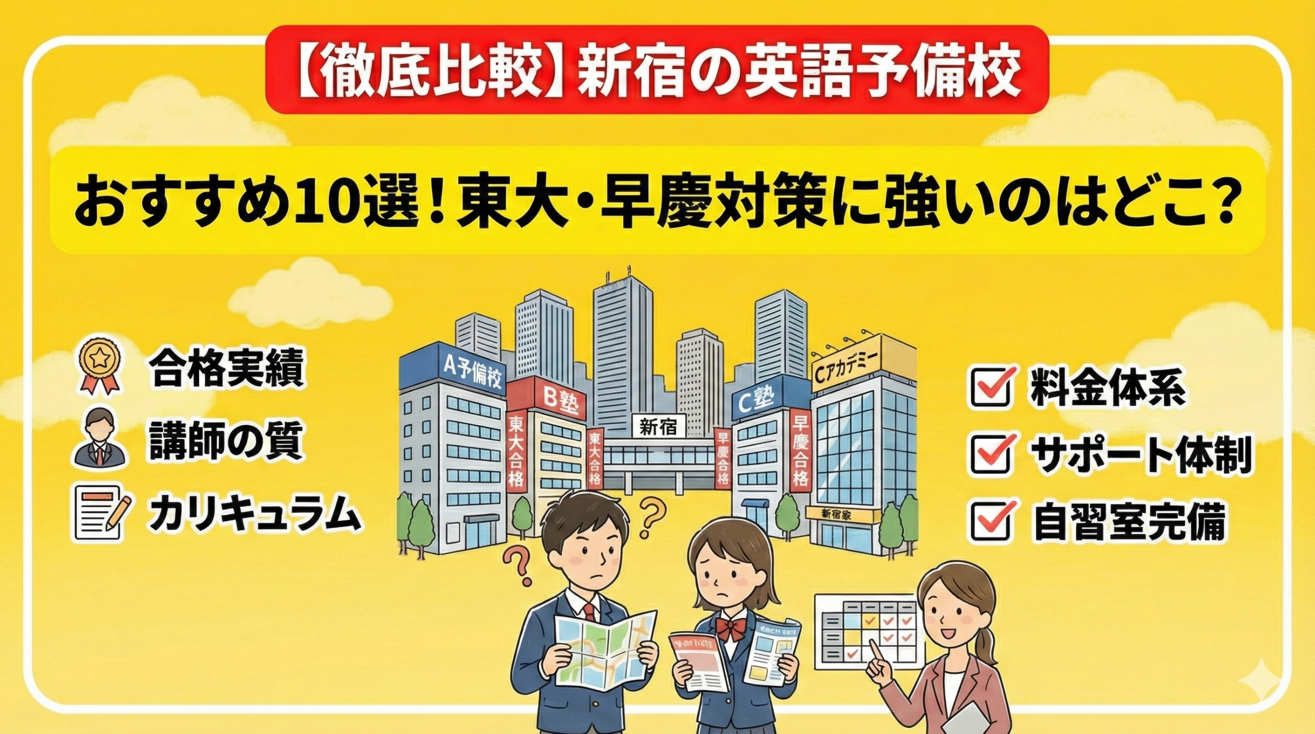 この記事では、新宿エリアの英語予備校・塾の現状を踏まえ、難関大学合格に必要な英語力を養成するための予備校選びの具体的な基準と、目的別のおすすめタイプを解説します。具体的な予備校名や料金については、最新かつ正確な情報を得るため、必ず各予備校の公式サイトをご確認いただくことを前提に、予備校選びの判断基準を提供します。