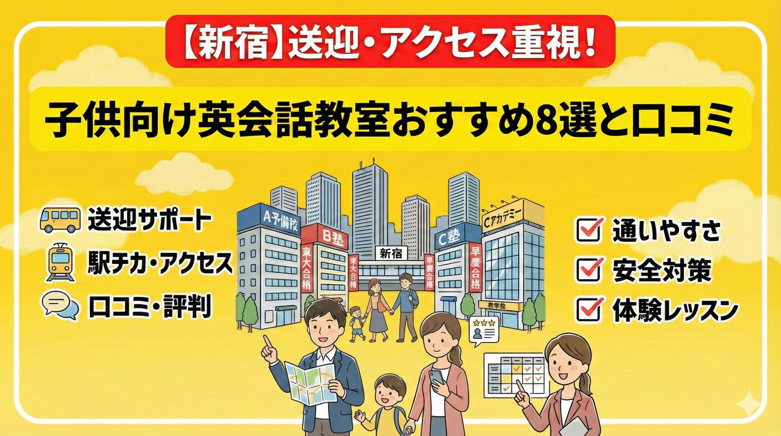 新宿で送迎・アクセスを重視した子供向け英会話教室を選ぶための鍵は、「立地の安全性」と「送迎サポートの充実度」です。